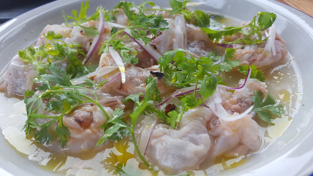 Molto gustosi i tacos di ricciola con salsa di rocoto, peperoncino dalla moderata piccantezza, insalata di cavolo rosso marinato e salicornia.