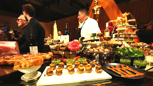 Nel Ray Dolby Ballroom del Hollywood & Highland Center®, gli ospiti potranno circolare liberamente per godersi la festa in una atmosfera "glamour e rilassata". Un esercito di 400 camerieri girerà incessantemente offrendo agli ospiti gli oltre 60 mini piatti creati appositamente da Wolfang Puck e il suo team di 120 cuochi. Come sempre non mancheranno i buffet a tema.