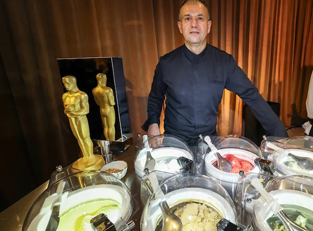 Il pastry chef che gestisce l' "angolo gelati", Kamel Guechida (nella foto) afferma che "questa macchina mantiene il gelato freddo e lo mescola in modo da ottenere una consistenza piacevole, omogenea e vellutata. Una macchina fantastica". Le star potranno scegliere fra diversi gusti come vaniglia, marzapane, fragola, pistacchio, stracciatella e nocciola con pezzetti di nocciola all' interno.