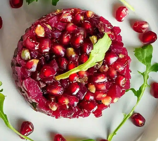 La tartare di melograno e barbabietola è un salutare antipasto vegetariano. La dolcezza naturale della barbabietola si unisce alla nota acidula e brillante dei chicchi di melograno, creando un piatto semplice ed elegante.