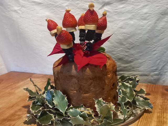 Poco prima di portarlo in tavola, trasferite il panettone sul piatto di portata e al suo centro infilate una stella di Natale e poi tutt'intorno gli spiedini di frutta.